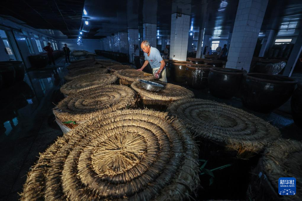 11月9日,在浙江省嘉兴市海盐沈荡酿造有限公司的酿酒车间内,酿酒师傅给装有糯米的酒缸落缸加药,加入酒曲发酵。