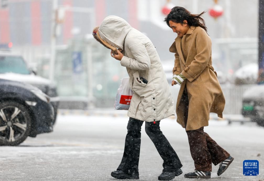 11月14日,在乌鲁木齐市光明路附近,市民走在风雪中。