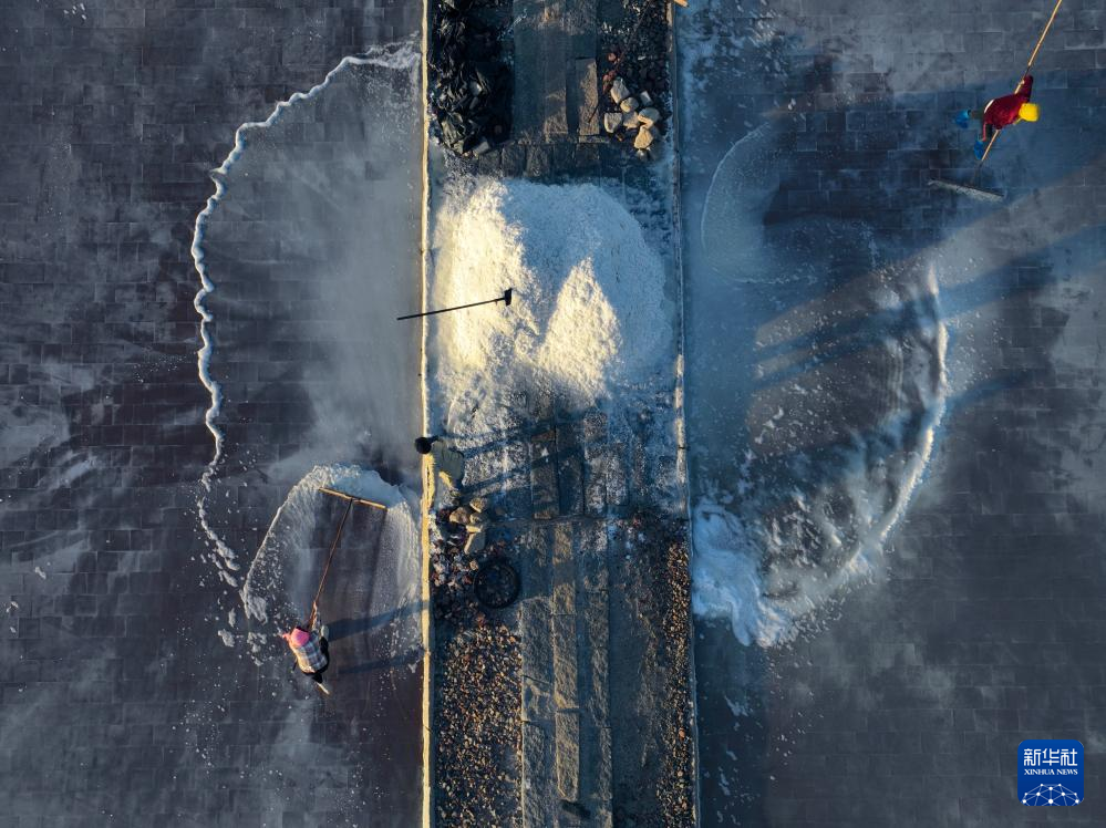 11月8日,在福建省泉州市泉港山腰盐场,盐工在盐田里劳作(无人机照片)。