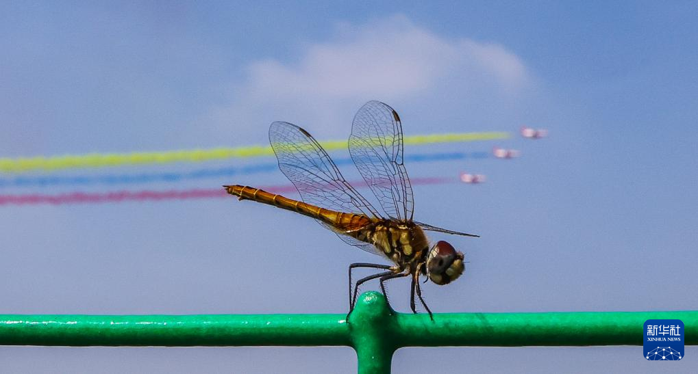11月12日,一只蜻蜓驻足在第十五届中国国际航空航天博览会附近的围栏上,与进行飞行表演的飞机相映成趣。