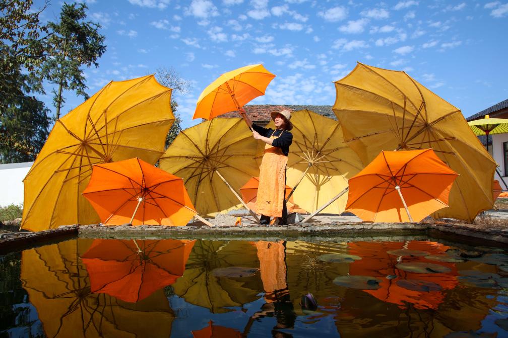 11月13日,在安徽省宣城市泾县昌桥乡孤峰村,国民油布伞厂的工人在晾晒油布伞。