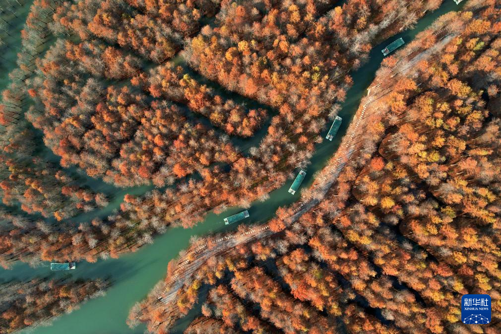 12月3日,在安徽省宁国市方塘乡,游客乘坐游船观赏红杉林(无人机照片)。