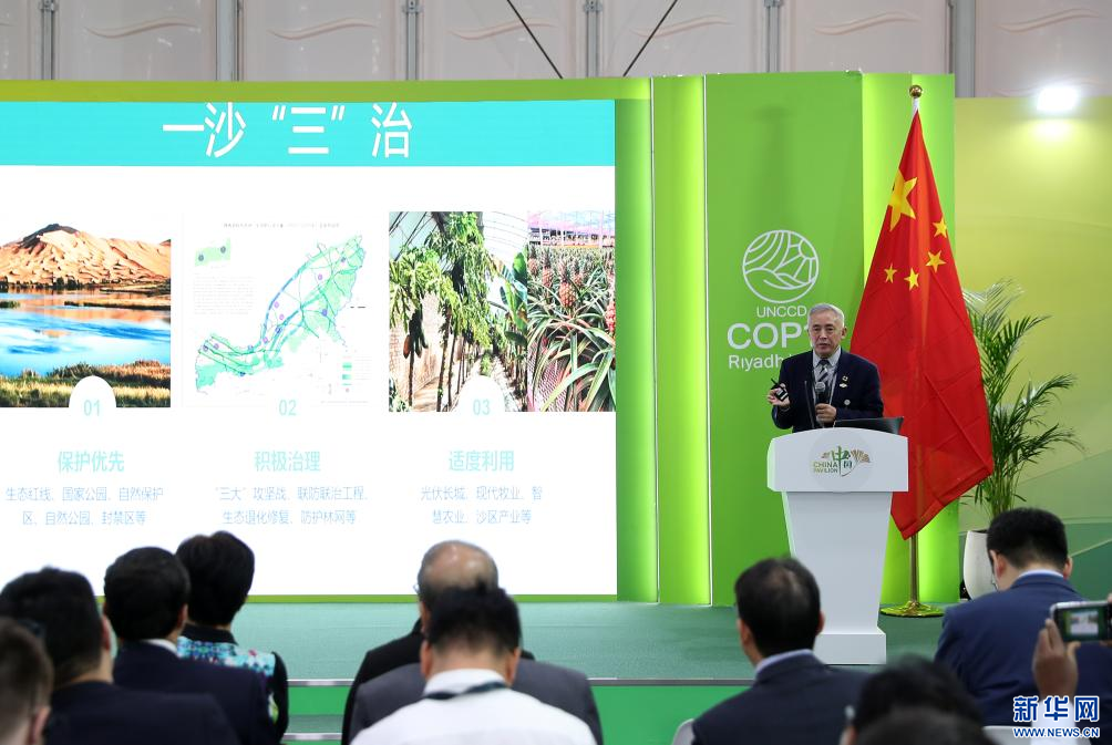 12月4日,在沙特阿拉伯首都利雅得,中国林业科学研究院首席科学家、三北工程研究院院长卢琦在《联合国防治荒漠化公约》第十六次缔约方大会中国馆的一场边会上发言。