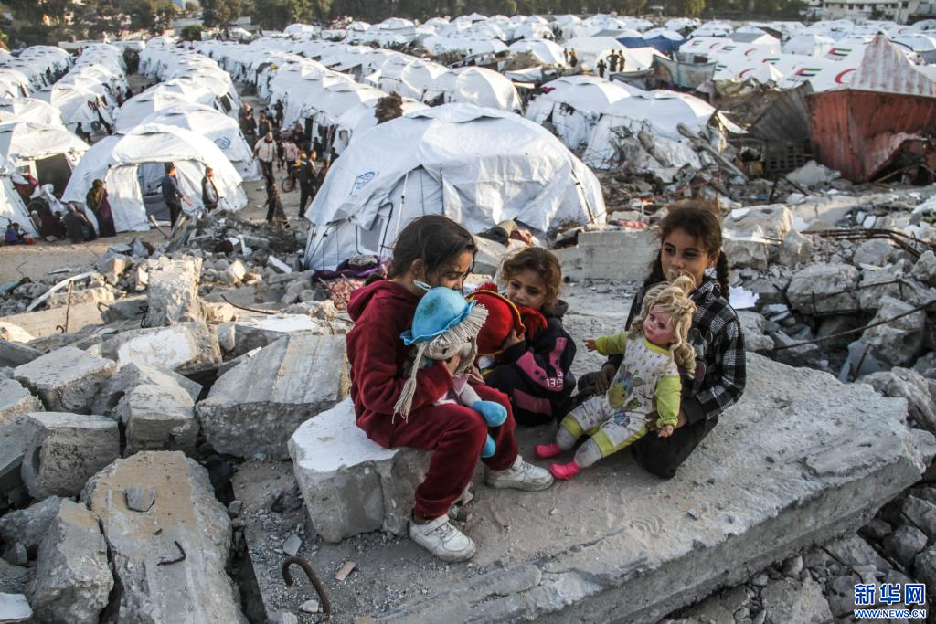 12月9日,在加沙地带加沙城,流离失所的孩子们在一处临时帐篷区玩耍。