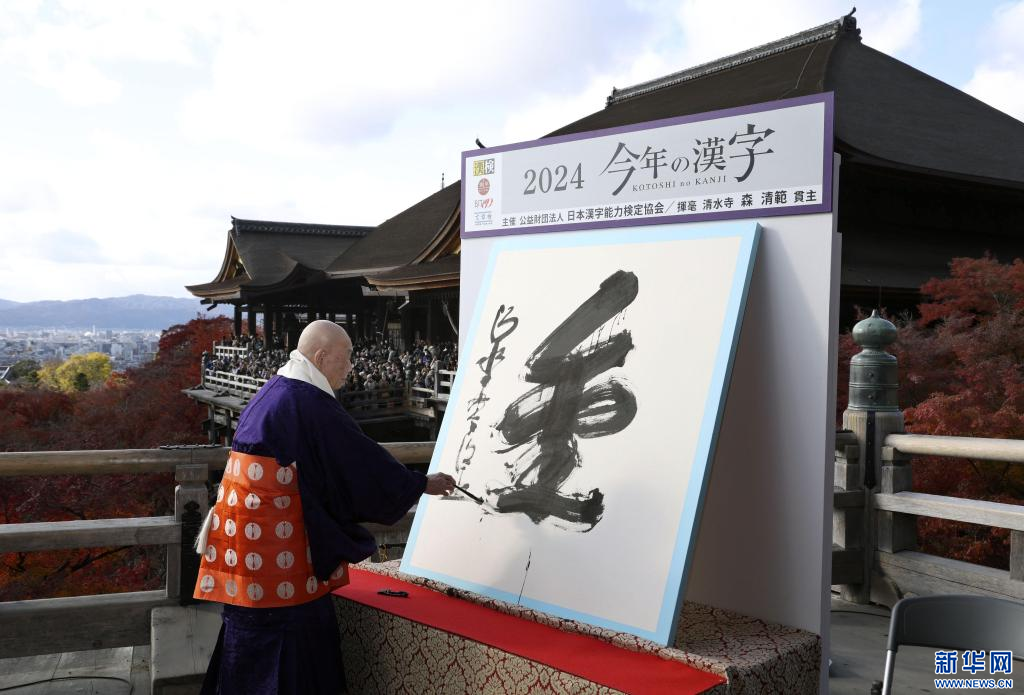 12月12日,在日本京都,清水寺住持森清范用毛笔书写日本2024年度汉字“金”字。