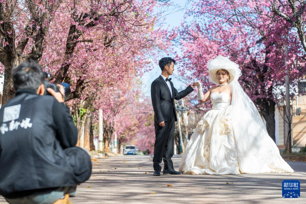 12月20日,一对新人在云南省大理白族自治州洱源县邓川镇德源山盛开的冬樱花下拍照。