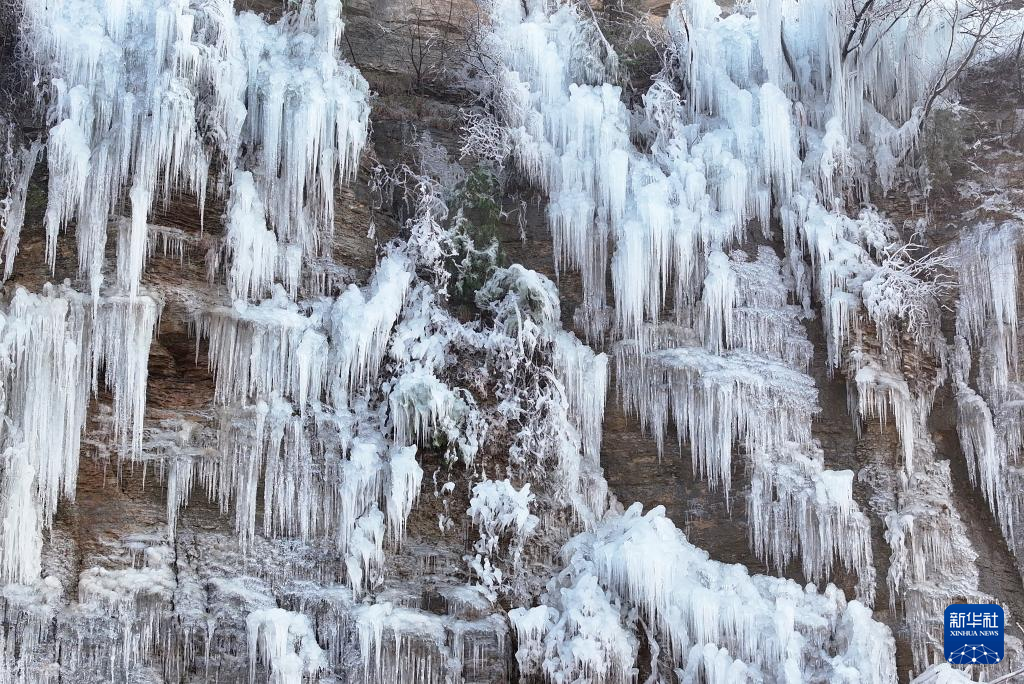 12月20日拍摄的山东省枣庄市山亭区岩底村一处山崖上的冰挂景观。