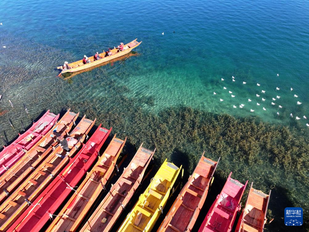 12月19日,游客在云南省宁蒗县泸沽湖乘船游玩(无人机照片)。