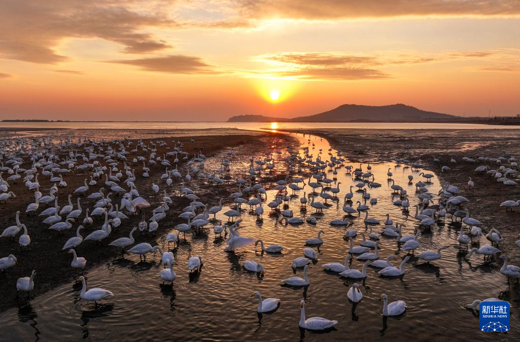 12月20日,成群大天鹅在山东省荣成市天鹅湖湿地栖息。