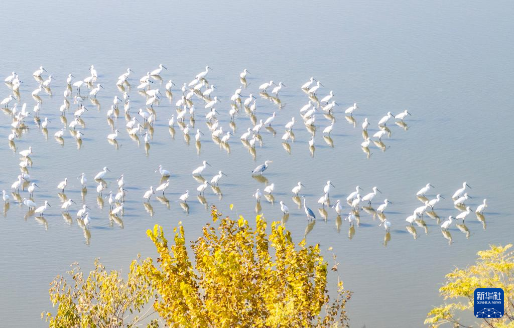 12月20日,候鸟在江苏兴化里下河国家湿地公园内栖息、觅食(无人机照片)。
