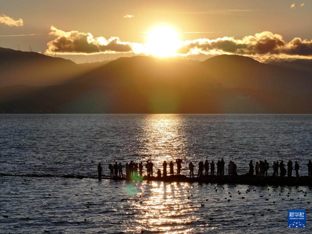 12月20日,游客在云南大理市大理镇洱海观看日出(无人机照片)。