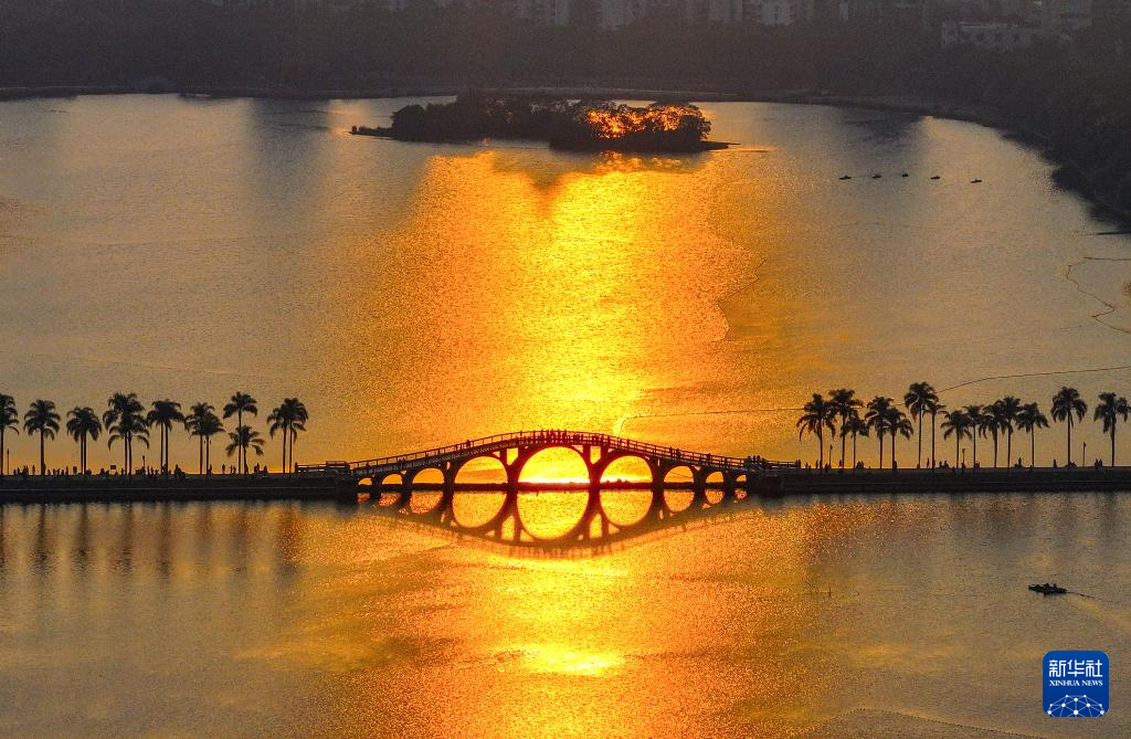 12月24日,游人在广西南宁市南湖公园的九孔桥欣赏夕阳美景(无人机照片)。