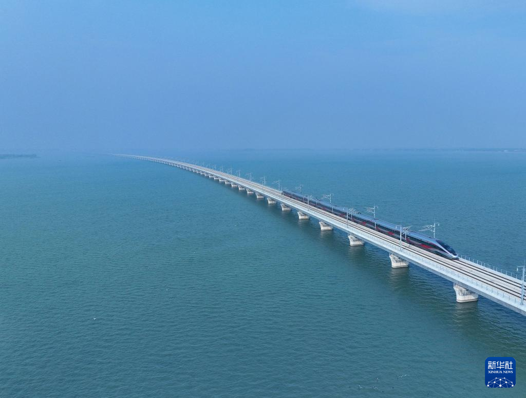 12月26日,上海经苏州至湖州高铁(沪苏湖高铁)开通运营,上海虹桥至湖州站最快55分钟可达。这是列车驶过沪苏湖高铁元荡湖段(无人机照片)。