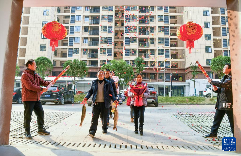春节临近,江西省宜春市铜鼓县永宁镇城南社区文昌苑安置小区洋溢着喜庆的氛围,居民陆续搬进新居,迎接蛇年春节的到来。