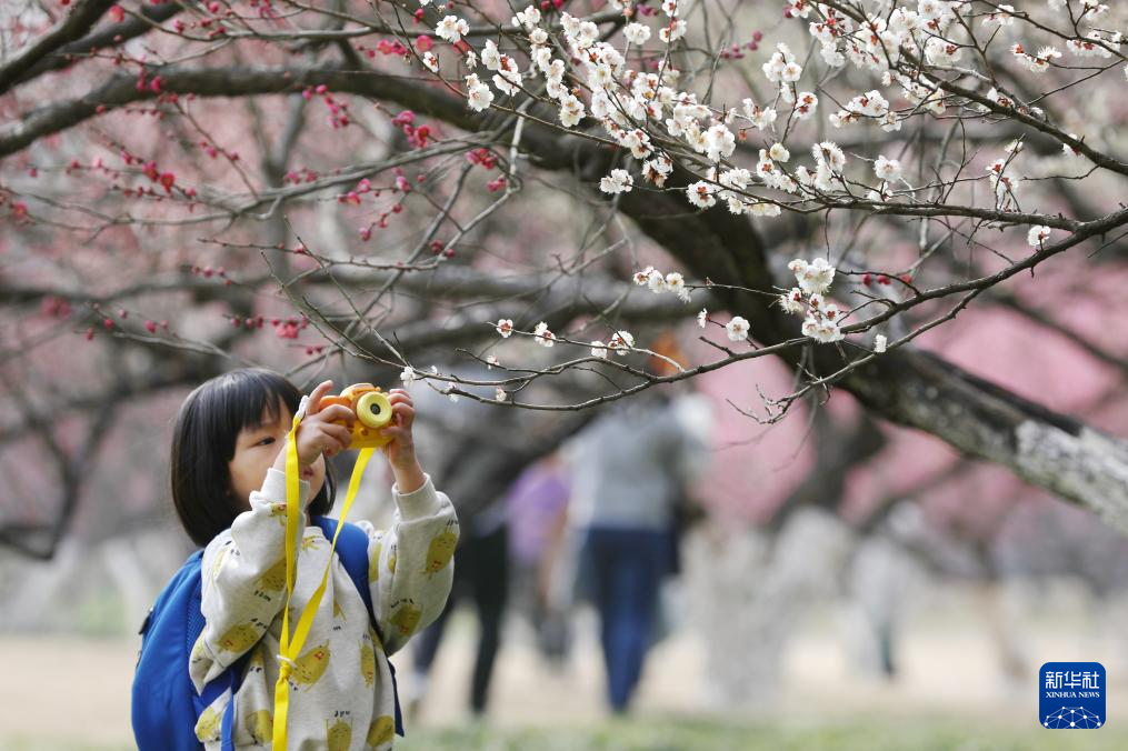 2月26日,小朋友在浙江省嘉兴市植物园欣赏梅花。