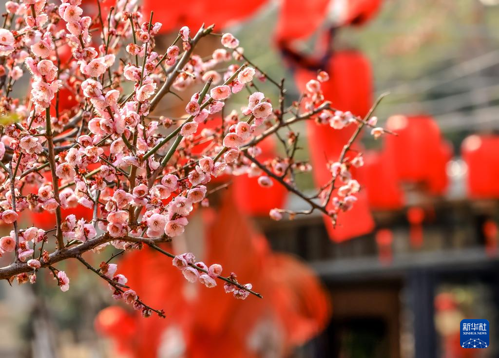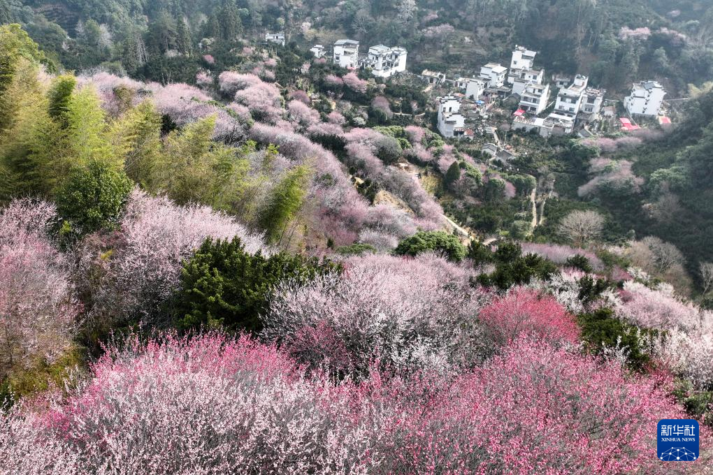 2月26日,在安徽省黄山市歙县雄村镇卖花渔村,绽放的梅花与徽派村落民居相映成趣。