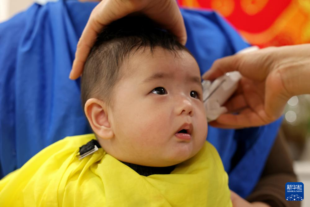 3月1日,小朋友在山东省枣庄市一家婴幼儿专业理发店理发。