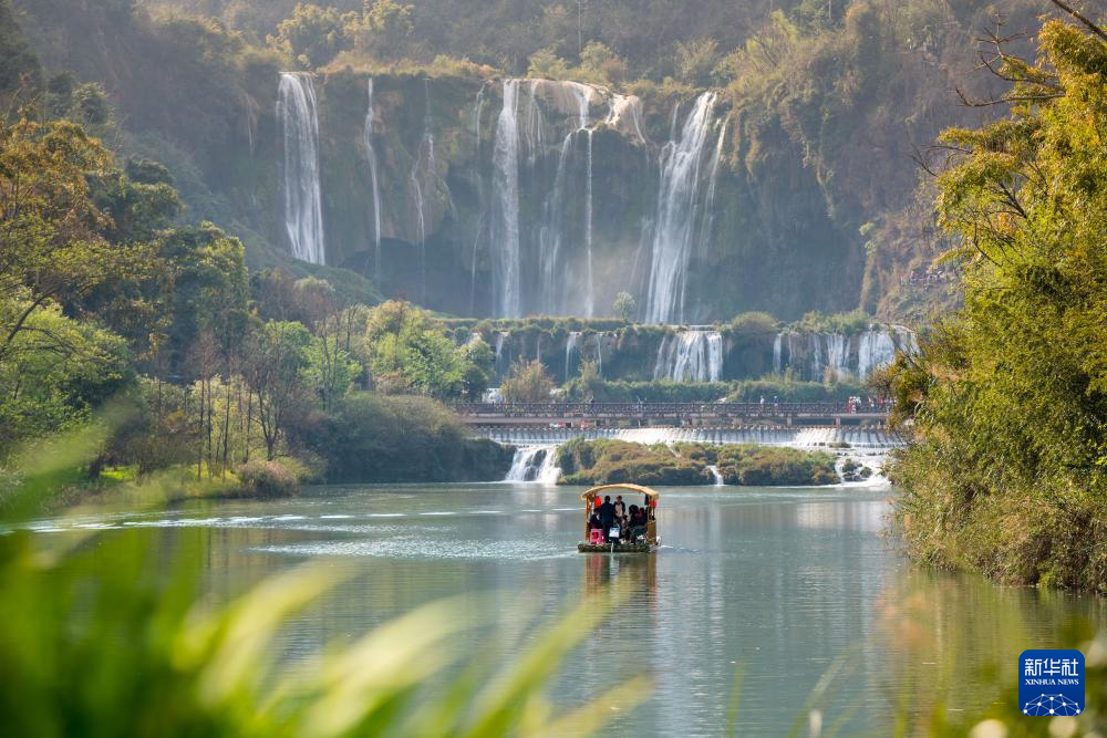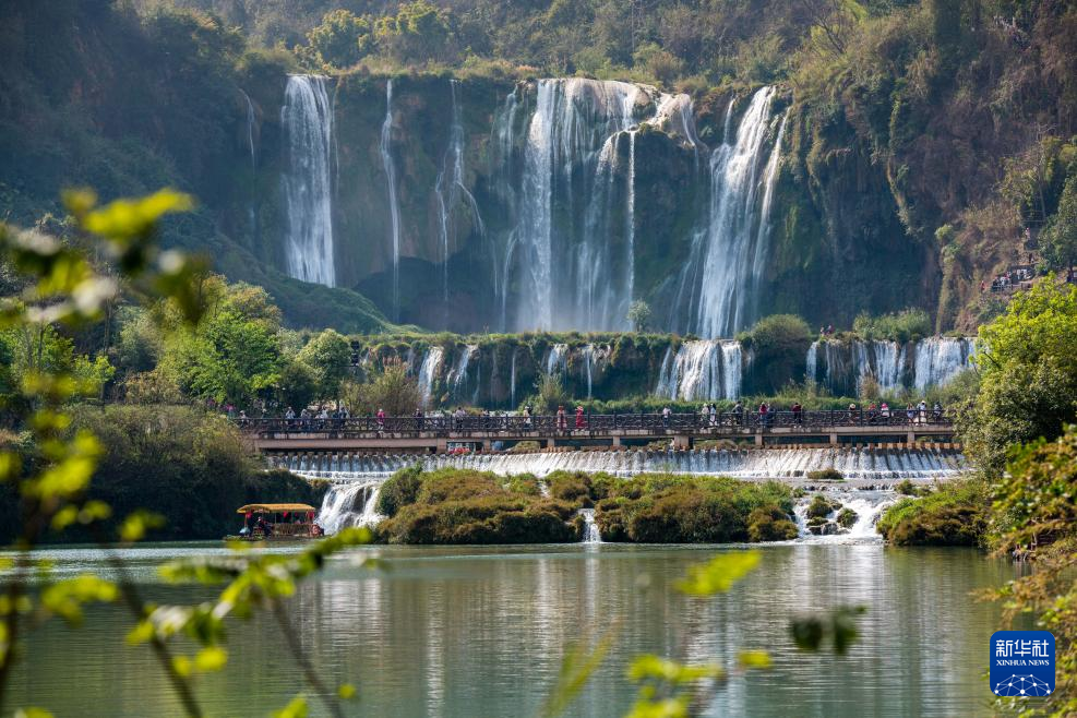 春日里,在云南省曲靖市罗平九龙瀑布群风景区,湖光山色美不胜收,吸引众多游客。