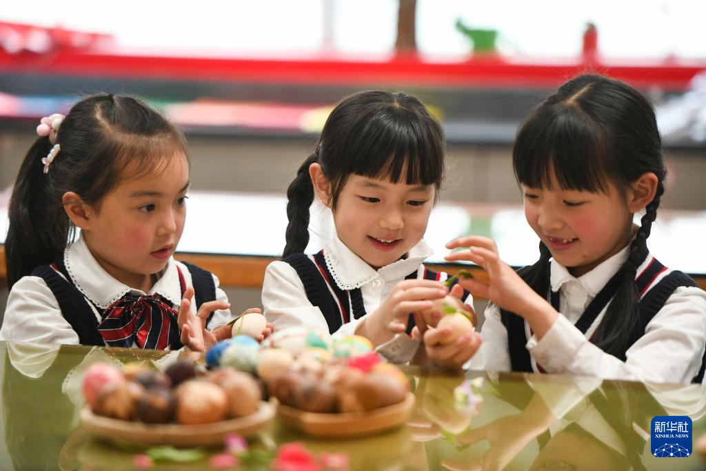 4月3日,在浙江省金华市婺城小学,小学生在制作清明花草蛋。