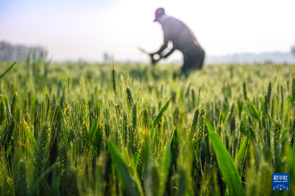 4月20日,在河南省商丘市夏邑县会亭镇郭楼村,村民在麦田内除杂。