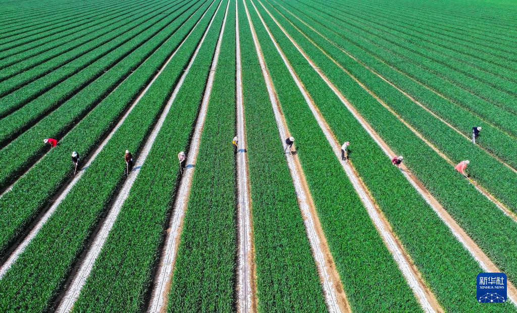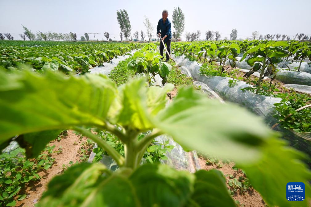 4月20日,河南省开封市祥符区范村乡百亩岗村农民在葵花地除草。