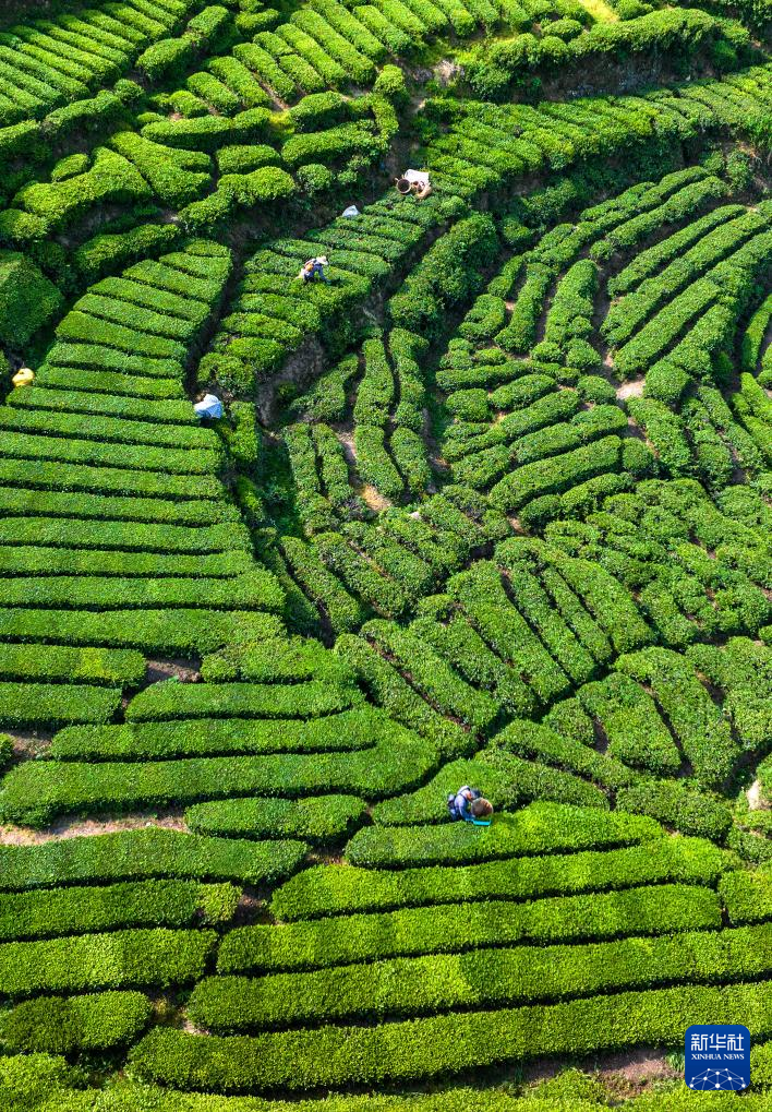 4月20日,茶农在浙江省湖州市吴兴区埭溪镇东红村采摘春茶(无人机照片)。