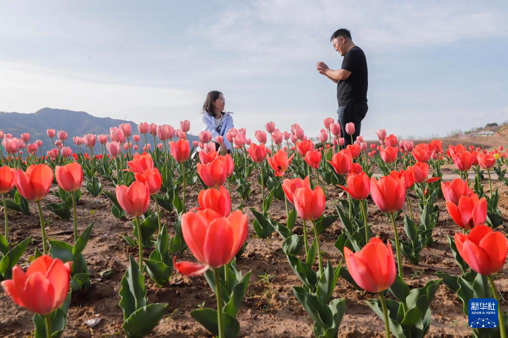 4月17日,游客在河北省唐山市迁西县旧城乡雨花谷景区欣赏郁金香。