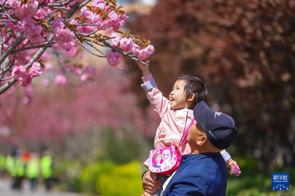 4月16日,小朋友在山东省青岛市李沧区九水街道衡水路赏花游玩。