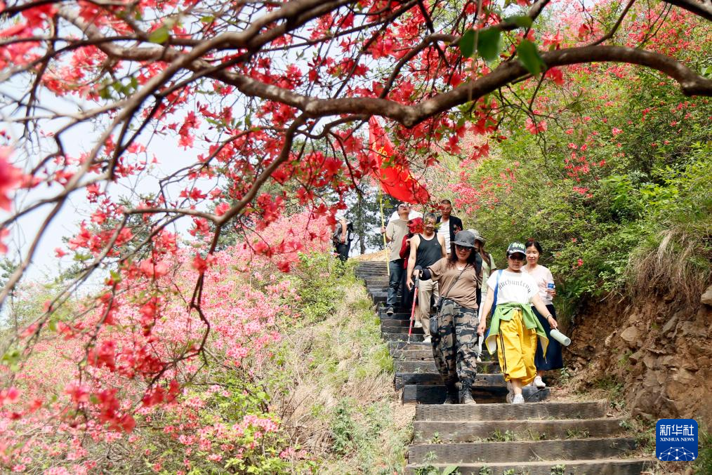 4月16日,游客在河南省洛阳市汝阳县王坪乡孟村观赏绽放的杜鹃花。
