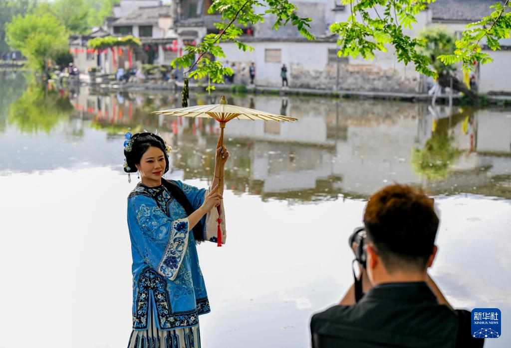 4月17日,游客在安徽省黄山市黟县宏村拍摄写真。