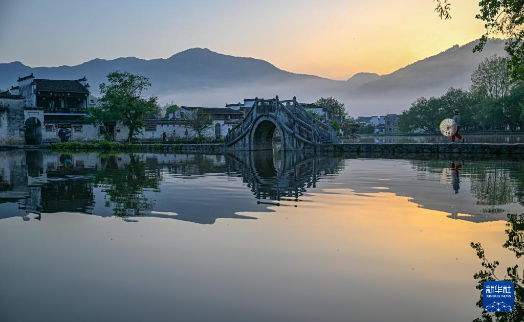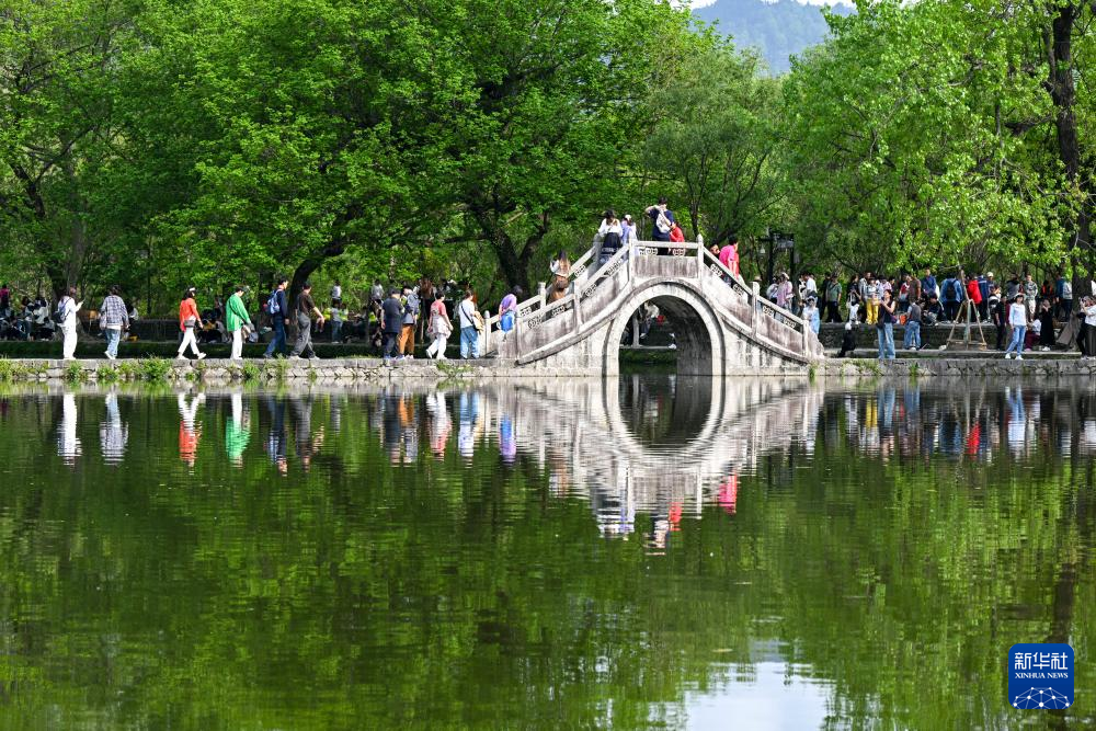 4月17日,在安徽省黄山市黟县宏村南湖,游客在桥上行走。