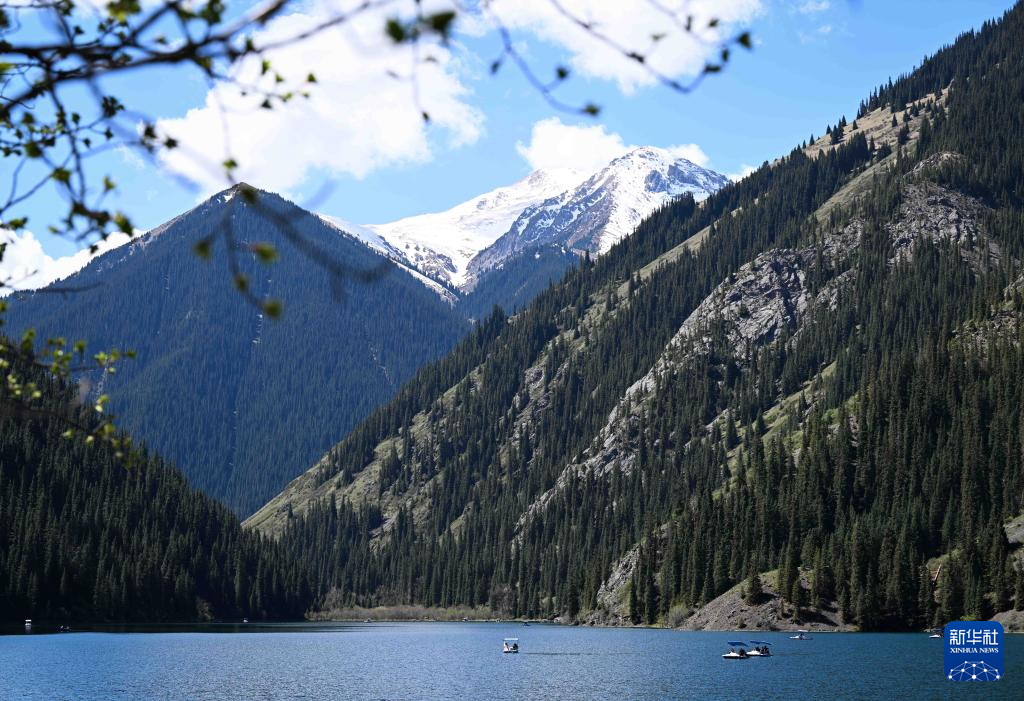 5月3日,人们在哈萨克斯坦阿拉木图州的科尔赛湖国家公园划船观光。