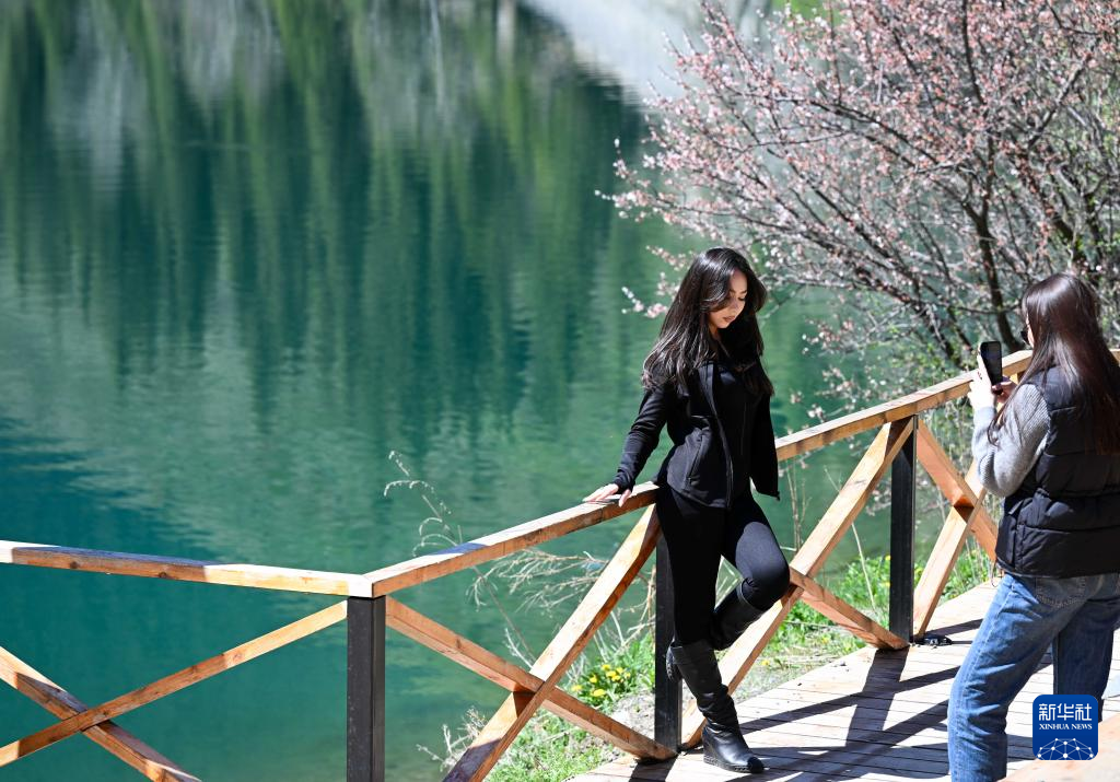 5月3日,人们在哈萨克斯坦阿拉木图州的科尔赛湖国家公园拍照留念。