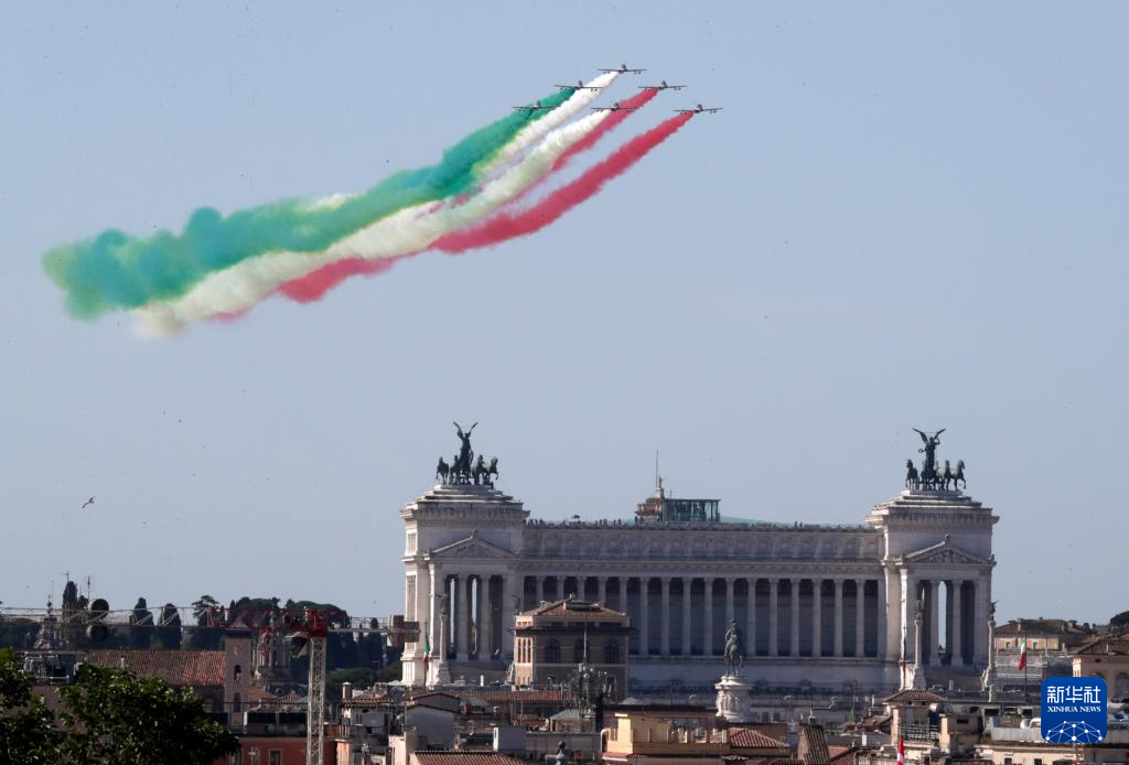 6月2日,意大利“三色箭”特技飞行表演队在共和国日庆祝活动中飞过罗马上空。