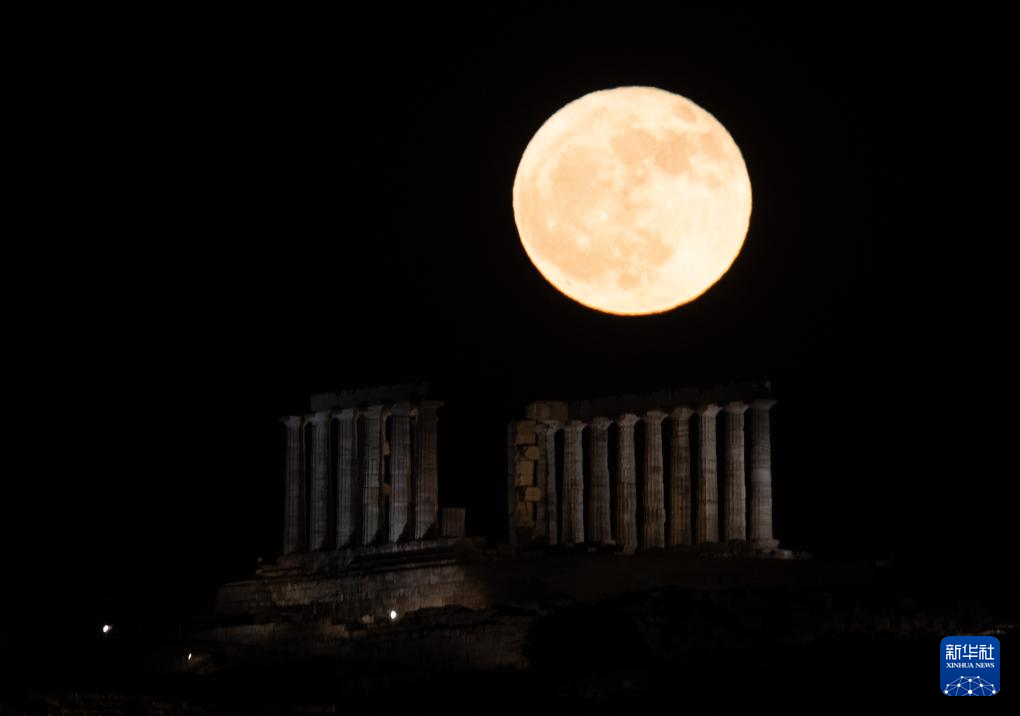 这是6月11日在希腊首都雅典附近苏尼翁角拍摄的波塞冬神庙上空的满月。