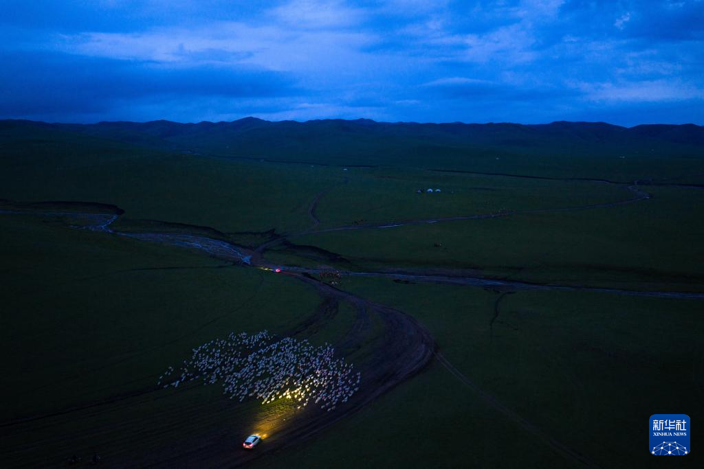 6月14日,牧民在阿鲁科尔沁草原上驱赶羊群赶夜路(无人机照片)。