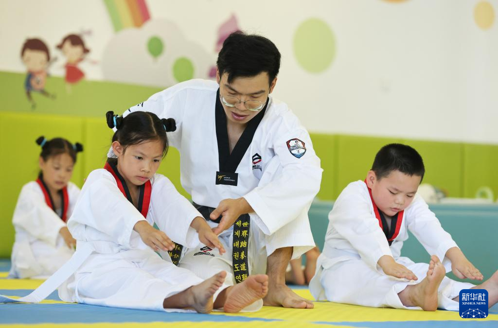 7月7日,在浙江省湖州市德清县乾元镇直街社区青少年宫,孩子在老师指导下学习跆拳道。
