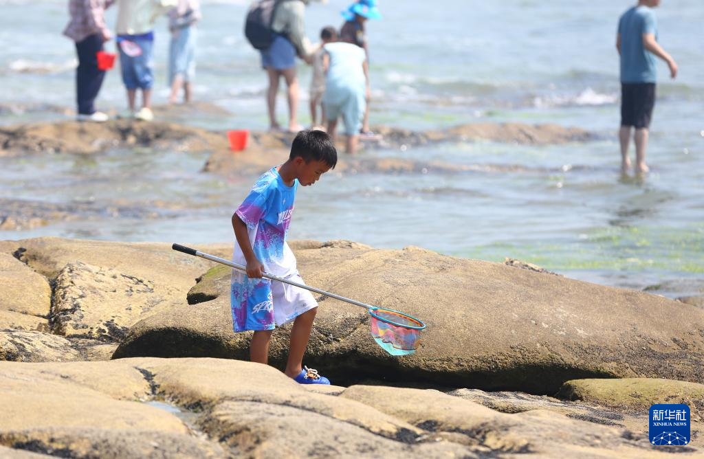 7月6日,小朋友在山东省日照市李家台赶海园赶海“寻宝”。
