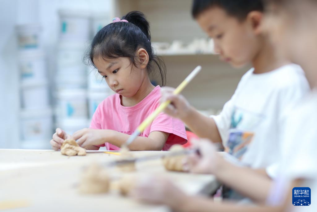 7月8日,在江苏省兴化市昭阳街道,小朋友在老师指导下制作陶艺作品。