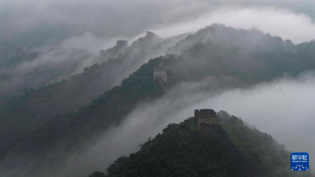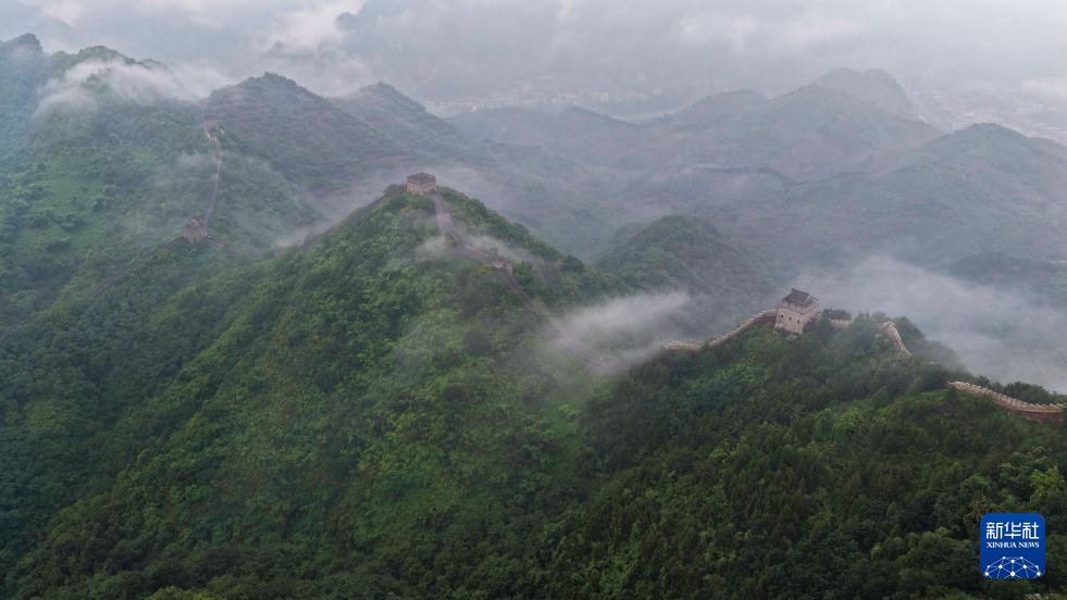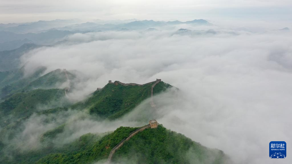 7月5日在河北省承德市兴隆县与天津市蓟州区交界处拍摄的黄崖关长城云海景观(无人机照片)。