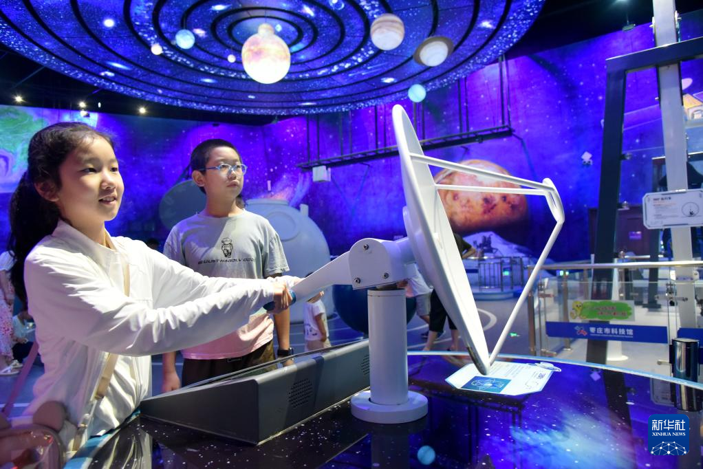 8月2日,小朋友在山东省枣庄市科技馆参观。