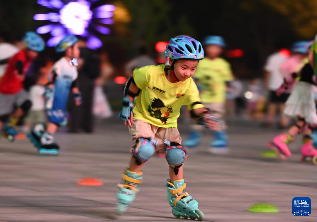 7月11日晚,在山东省滕州市市民广场,孩子们在学习轮滑。