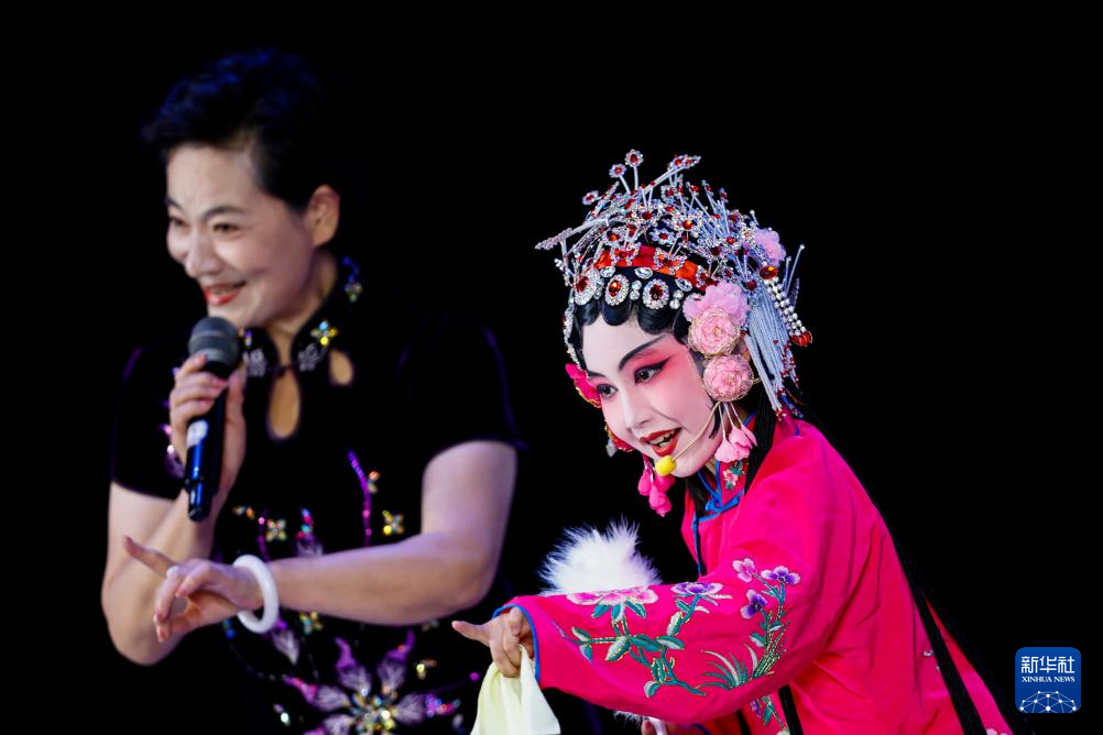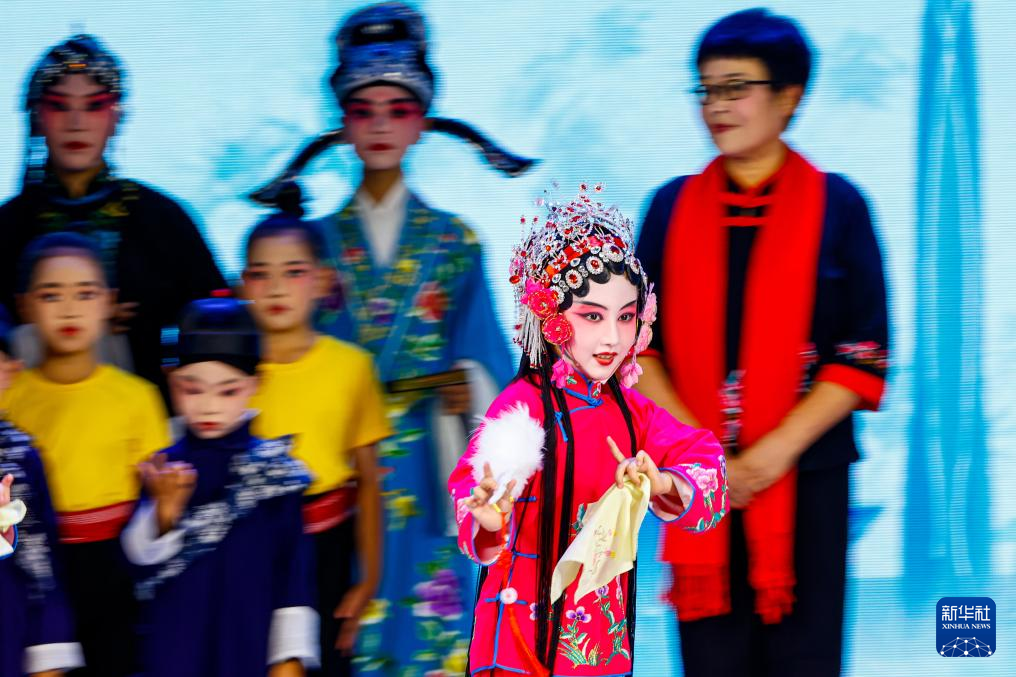 7月12日,在天津市滨海新区汉沽大剧院,孩子们在表演传统戏曲。