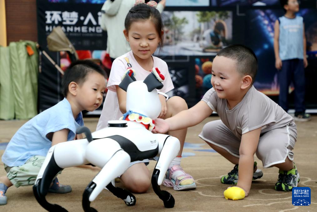 8月3日,山东省东营市的小朋友在AI智能机器人科普展上与智能机器人互动。