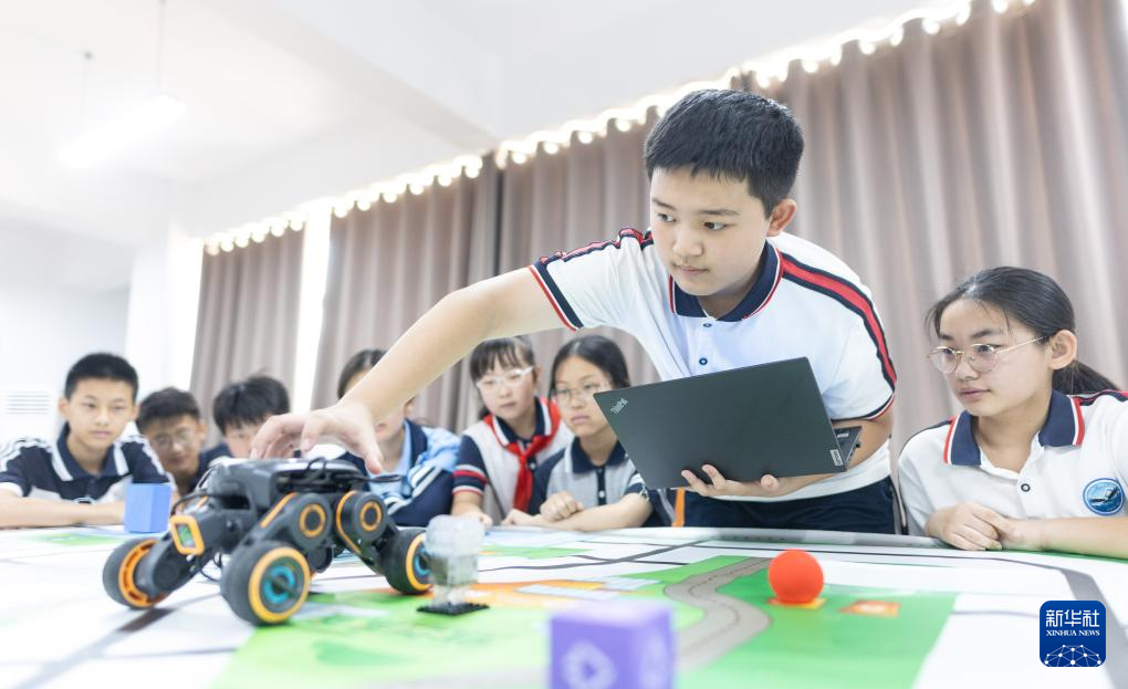 7月12日,在山东省临沂第十中学举行的科创训练营活动中,学生进行轮式机器人调试。