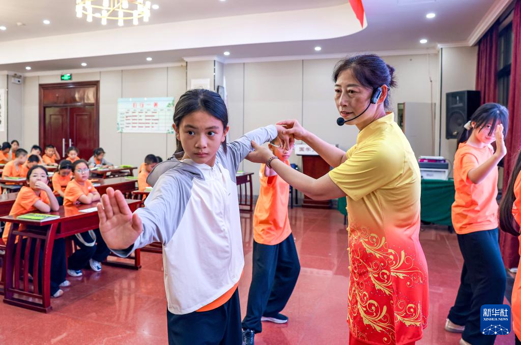 7月12日,在江苏省扬州市江都区妇联举办的公益国学夏令营活动中,武术教练指导儿童练习五步拳。