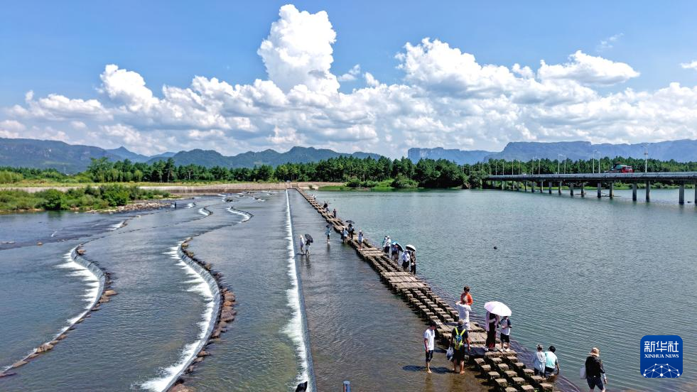 8月11日,游人在浙江省台州市仙居县永安溪白塔镇段游玩(无人机照片)。