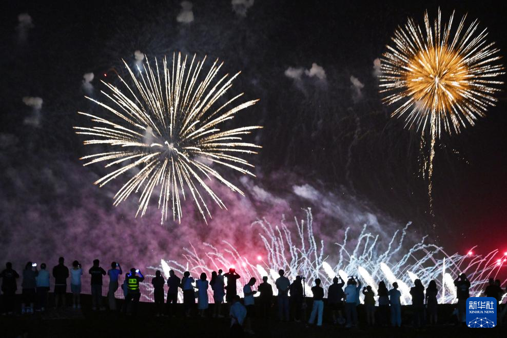 8月10日,游客在宁夏中卫市沙坡头区观看烟花表演。