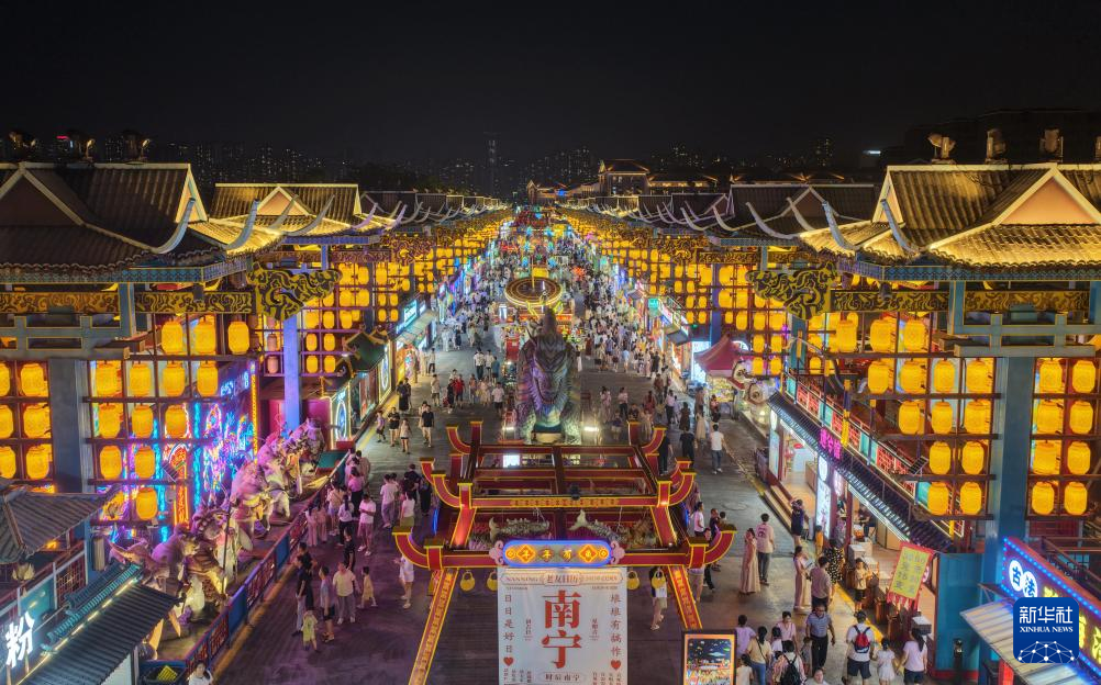 8月9日,在广西南宁市“南宁之夜”街区,游客逛夜市(无人机照片)。