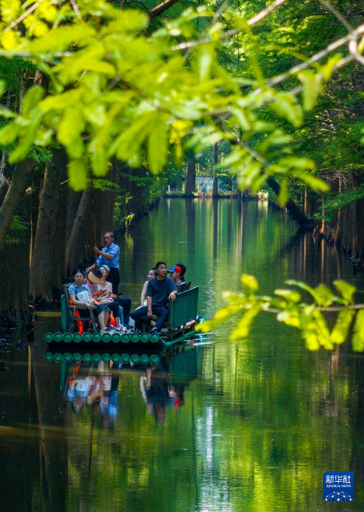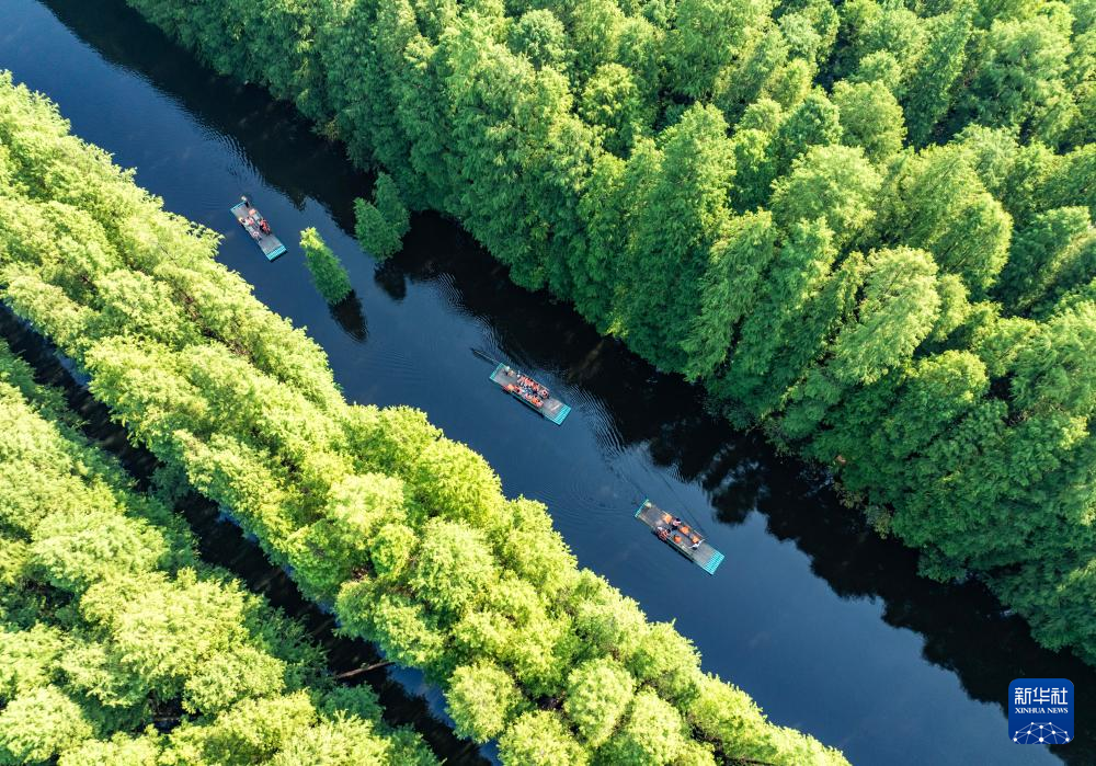 8月30日,游人在江苏省淮安市金湖县水上森林景区乘坐竹筏游览美景(无人机照片)。